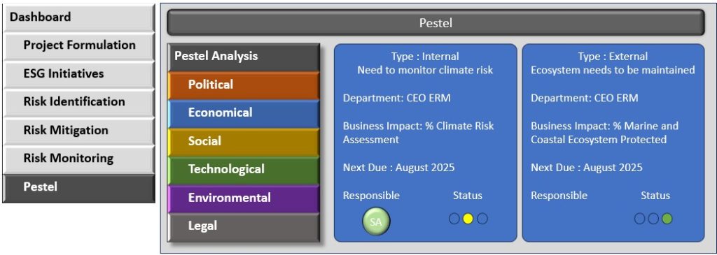 Dengan integrasinya yang mudah dengan strategi dan sistem manajemen kinerja yang ada, kami menyediakan pendekatan yang menyeluruh untuk mengelola protokol manajemen risiko perusahaan. Aplikasi ERM kami memastikan bahwa manajemen risiko terkait erat dengan tujuan strategis dan pengukuran kinerja, yang memungkinkan organisasi untuk secara proaktif mengatur dan mengubah prosedur manajemen risiko mereka dalam kerangka tujuan bisnis yang lebih luas. Kami menjamin bahwa manajemen risiko selaras erat dengan tujuan strategis dan ukuran kinerja.